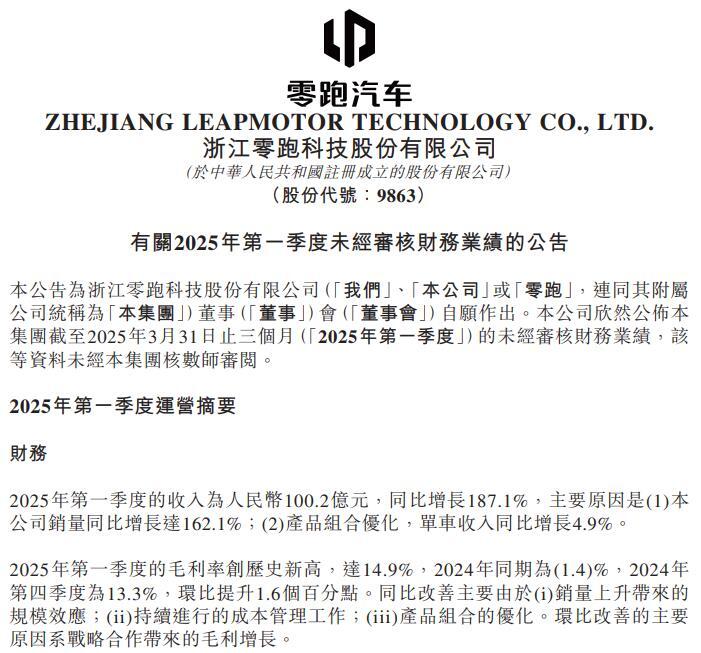 5月19日,零跑汽车(9863.HK)发布2025年一季度财报。期内,零跑汽车营收突破百亿元大关,达100.2亿元,同比增长187.1%。毛利率同样突破历史新高,达到14.9%,破除了“零跑造便宜车难赚钱”的质疑。对此,零跑汽车分析,一季度毛利同比改善主要由于销量上升带来的规模效应,持续进行的成本管理工作和产品组合的优化;环比改善的主要原因系战略合作带来的毛利增长。