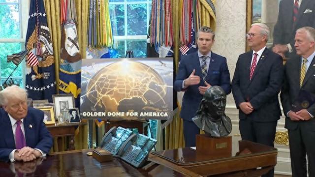 当天,在国防部长赫格塞思陪同下,特朗普在椭圆形办公室官宣“金穹”计划。他身旁是一张概念图,描绘了一幅“金穹”笼罩美国的景象。