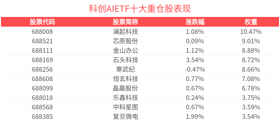 数据显示,截至2025年4月30日,上证科创板人工智能指数(950180)前十大权重股分别为澜起科技(688008)、寒武纪(688256)、金山办公(688111)、芯原股份(688521)、恒玄科技(688608)、石头科技(688169)、晶晨股份(688099)、复旦微电(688385)、乐鑫科技(688018)、中科星图(688568),前十大权重股合计占比70.68%。