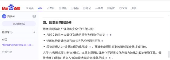 百度AI回答“AI大模型引发的文章八股化现象”截图(内容):AI大模型引发的文章“八股化”现象,是技术工具与人类创作边界模糊的产物,其本质反映了技术应用过程中形式与实质的失衡。结合当前实践与文献研究,可从以下维度分析: