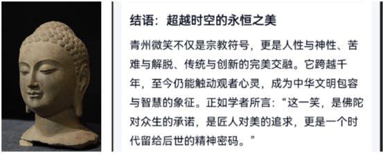 我华强北宋仕强大爷已经由当年意气风发的“华强北战神”蜕变成与世无争的佛系小老头了,白天喝喝茶盘盘串晚上不撸串毅然决然远离油腻。我前几年去了一趟太原天龙寺,喜欢上北魏和北齐的石刻佛像,这些独特爱好和生僻的知识,我也去盘了一下百度AI大模型,它的回答基本靠谱。对于佛像“青州微笑”的结语对应了我的知识库,但是北魏佛像显著的“湿衣纹”特征就没有什么内容呈现出来,可能是百度调取大模型数据库这方面的资料偏少吧。我比较开心的是没有百度那么多的小广告!