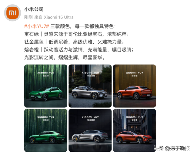 发布会上,雷军介绍了小米YU7的四款配色——宝石绿、钛金属、寒武岩灰、熔岩橙,还有5款将在之后的发布会上介绍。