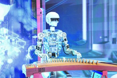 5月23日,在文博会现场,机器人表演弹古筝。