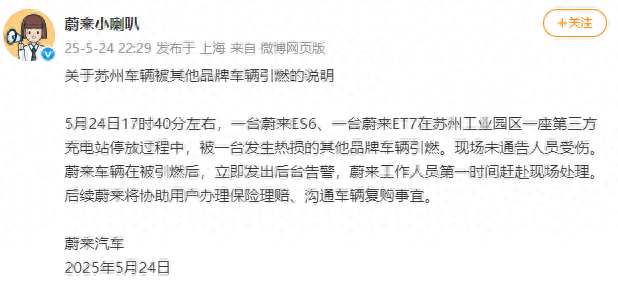 5月24日17时40分左右,一台蔚来ES6、一台蔚来ET7在苏州工业园区一座第三方充电站停放过程中,被一台发生热损的其他品牌车辆引燃。现场未通告人员受伤。