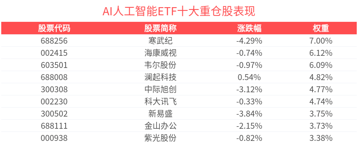 数据显示,截至2025年4月30日,中证人工智能主题指数(930713)前十大权重股分别为寒武纪(688256)、韦尔股份(603501)、海康威视(002415)、中科曙光(603019)、澜起科技(688008)、科大讯飞(002230)、中际旭创(300308)、金山办公(688111)、新易盛(300502)、紫光股份(000938),前十大权重股合计占比50.64%。
