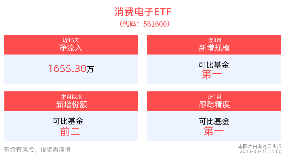 规模方面,消费电子ETF近3月规模增长834.05万元,实现显著增长,新增规模位居可比基金1/5。