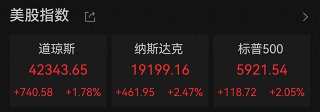 美东时间周二,美股三大指数集体上涨。道琼斯工业指数收涨1.78%,报42343.65点。纳斯达克指数收涨2.47%,报19199.16点。标普500指数收涨2.05%,报5921.54点。