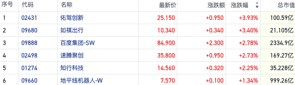 截至发稿,佑驾创新(02431.HK)涨近4%,如祺出行(09680.HK)涨超3%,百度(09888.HK)涨逾2%,速腾聚创(02498.HK)、地平线机器人(09660.HK)等产业链公司也纷纷跟涨。