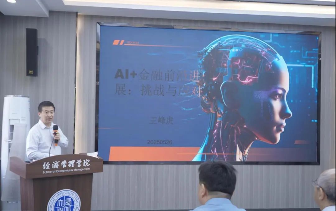 随后,西北大学经济管理学院金融系副主任王峰虎带来《AI+金融前沿进展:挑战与应对》主旨演讲。剖析了AI+金融通过核心技术提升金融服务效率、智能化水平和安全性,涵盖风险管理、算法交易、客户服务等前沿进展,分析市场规模与产业重构,探讨技术瓶颈、监管困境及人才需求。