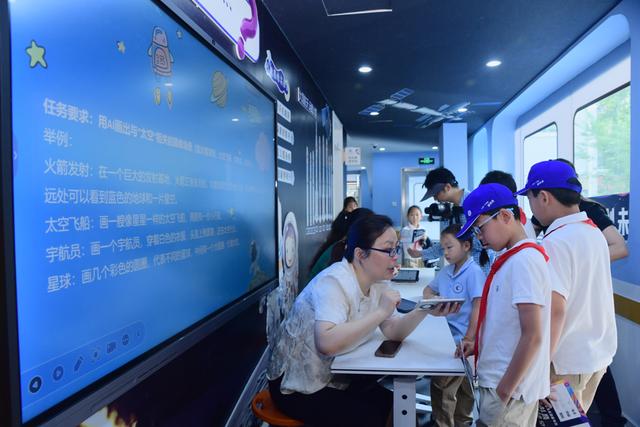 作为全国中小学人工智能教育基地校,AI特色成为曲阳四小今年六一节活动的亮点。在“智创未来” 课程中,同学们通过AIGC来实现同学们脑海中的创意设计。只见有的同学通过语音输入一段自己想象中的火箭发射场景:“在一片巨大的发射基地,火箭正在准备发射,火箭底部有熊熊燃烧的火焰,远处可以看到蓝色的地球和一片天空。”不一会儿,AIGC便自动生成了一幅图画。