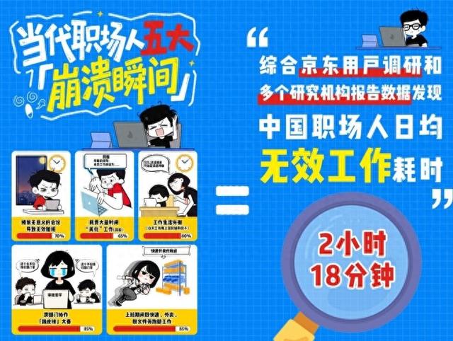 据京东用户调研及多个机构研究数据显示,中国职场人每天陷入无效或低效工作的时间平均高达2小时18分钟。频繁无意义的会议、耗费大量时间“美化”工作、工作生活失衡以及跨部门协作中的“踢皮球”现象,成为职场人最为头疼的五大问题。这些低效场景不仅影响了工作效率,更在一定程度上降低了职场人的工作满意度和生活质量。