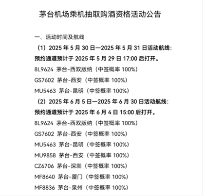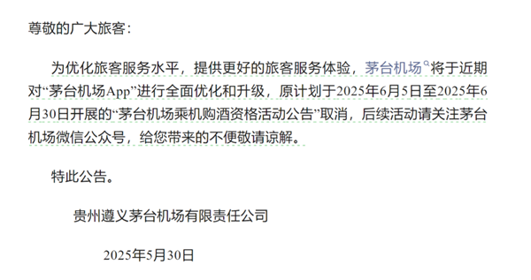 而在5月30日,遵义茅台机场微信公众号发布公告称:原计划于2025年6月5日至2025年6月30日开展的“茅台机场乘机购酒资格活动公告”取消。