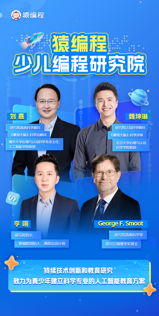 为提升编程教育的科学性和创新性,猿编程早在2020年成立了“少儿编程研究院”,汇聚了脑科学、人工智能等领域的顶尖专家。猿编程创始人李翊担任研究院院长,诺贝尔物理学奖得主、宇宙胚胎学之父乔治·斯穆特教授担任首席科学家,《最强大脑》科学总顾问、清华大学人工智能学院教授刘嘉担任首席科学顾问,《最强大脑》科学评审、北京大学心理与认知科学学院教授魏坤琳担任认知科学顾问。猿编程少儿编程研究院成立以来,持续推动技术创新与教育研究的不断突破,与跨领域顶尖专家们紧密合作,共同为课程开发提供科学指导,引领猿编程在少儿编程领域迈向新高度。