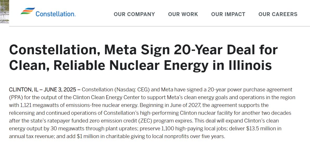根据发布的声明,从2027年6月开始,Meta将从Constellation位于伊利诺伊州的克林顿清洁能源中心购买大约1.1吉瓦的电力,这是该中心一座核反应堆的全部发电量。