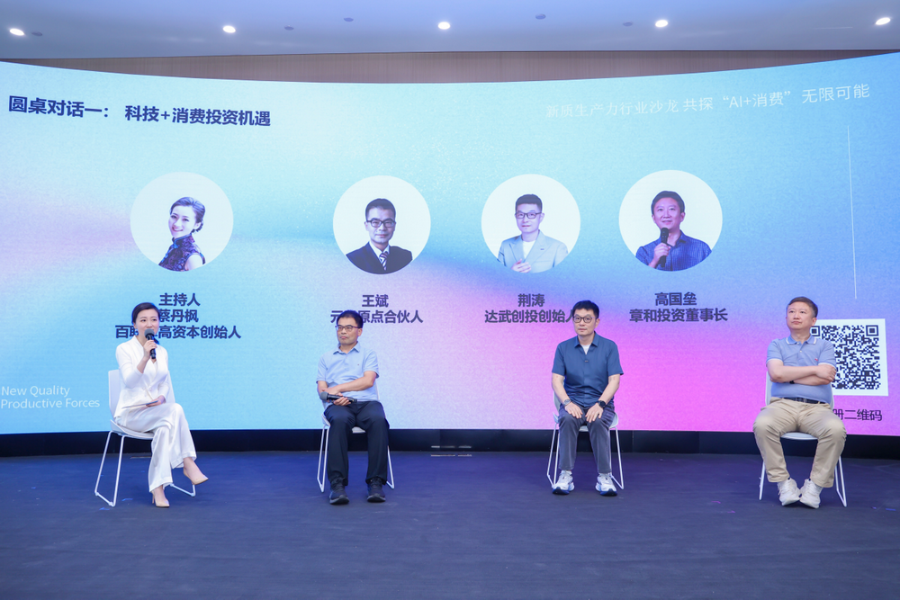 在圆桌论坛一中,百联挚高资本创始合伙人蔡丹枫、元禾原点合伙人王斌、达武创投创始合伙人荆涛以及章和投资董事长高国垒,就“AI+消费”领域的“募投管退”相关话题进行了探讨与观点分享。