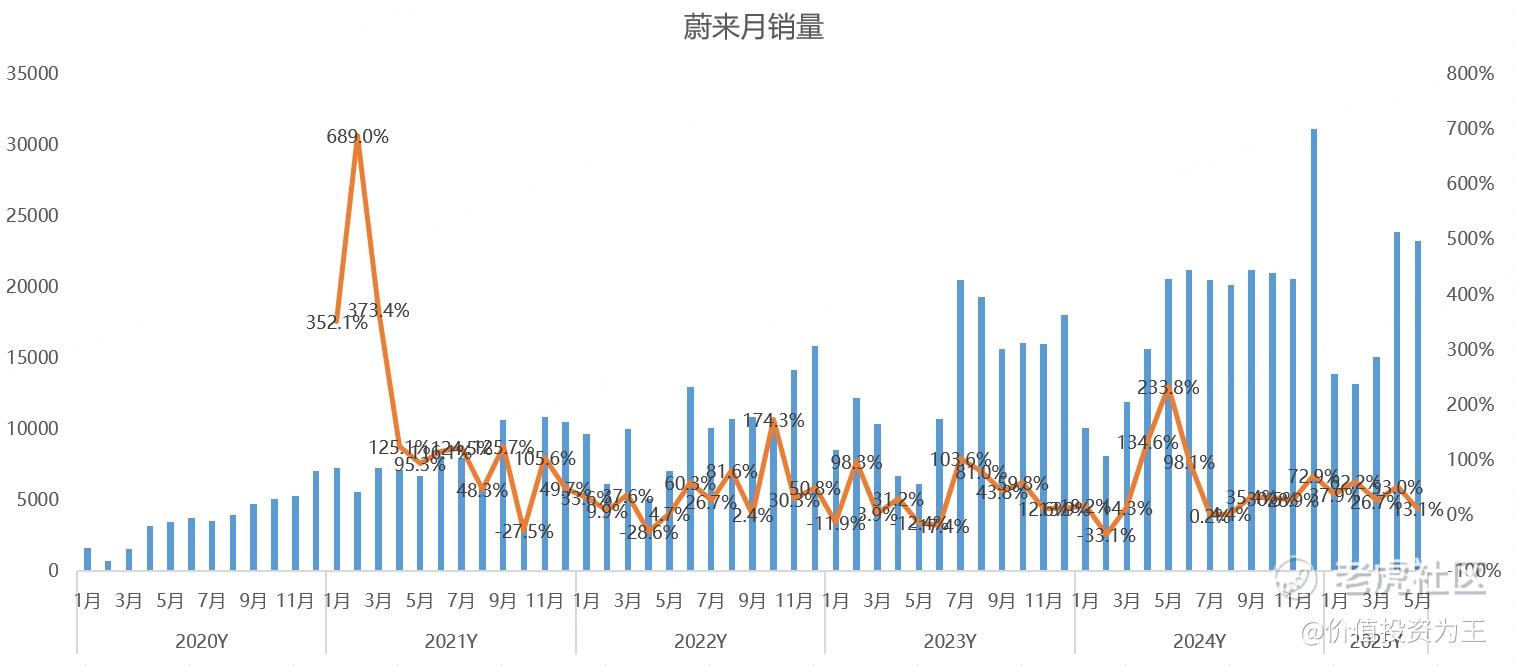 根据管理层的指引,预计二季度销量在7.2-7.5万辆之间,据此推算,蔚来6月份销量有望达到26369辆,同比增长24.3%。