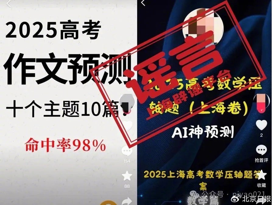 上海辟谣平台调查发现,“AI押题”的真相是偷换概念或“标题党”,其本质是部分自媒体为吸引眼球或推销自己的有偿服务而进行的虚假营销,误导考生和家长。