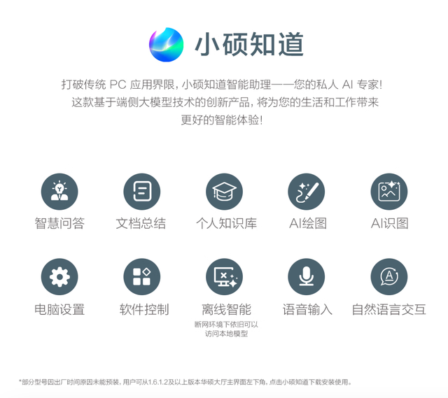 为全面接管你的办公所需,它还引入小硕知道AI智能助手,基于端云一体大模型提供智慧问答、文档总结、AI识图、AI绘图、电脑设置、软件控制等诸多功能,即便身处网络不佳的差旅途中,也能通过本地模型持续助力。