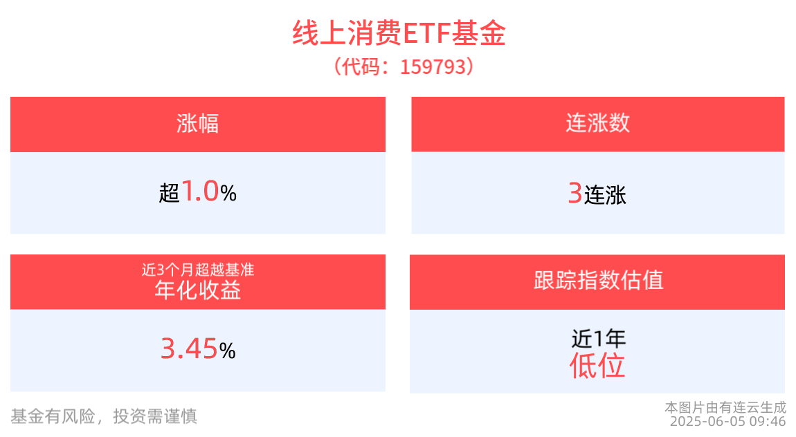 截至2025年6月5日 09:46,中证沪港深线上消费主题指数(931481)强势上涨1.31%,成分股阅文集团(00772)上涨6.82%,高鑫零售(06808)上涨5.51%,快手-W(01024)上涨4.05%,哔哩哔哩-W(09626),阿里巴巴-W(09988)等个股跟涨。线上消费ETF基金(159793)上涨1.01%, 冲击3连涨。最新价报0.9元。拉长时间看,截至2025年6月4日,线上消费ETF基金近1周累计上涨1.83%。