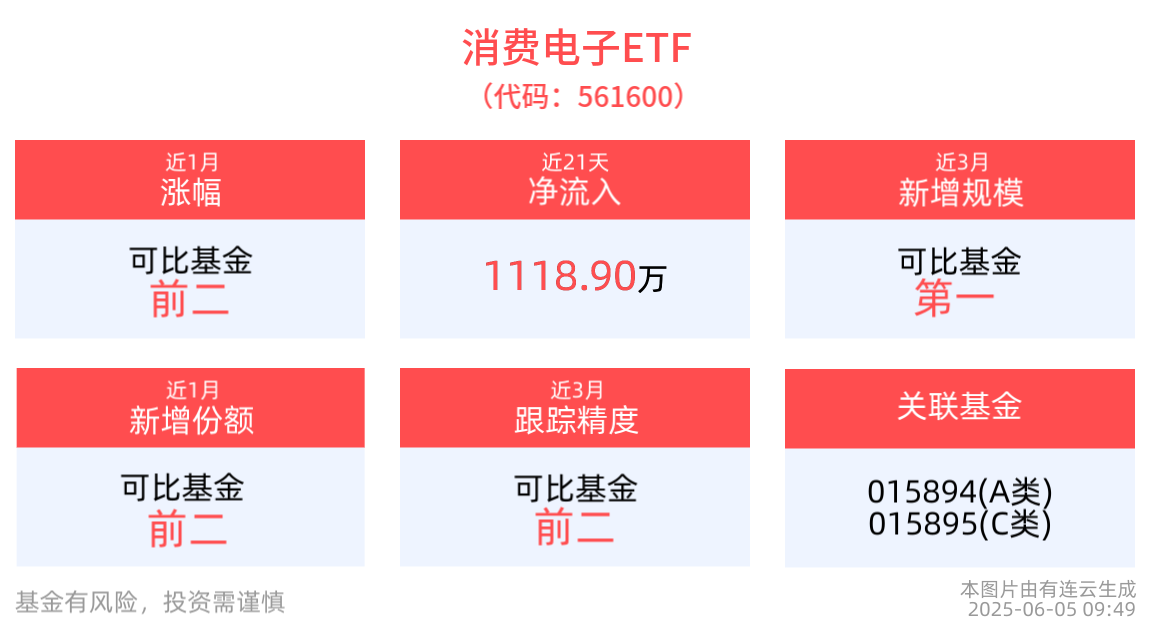 份额方面,消费电子ETF近1月份额增长1300.00万份,实现显著增长,新增份额位居可比基金2/5。