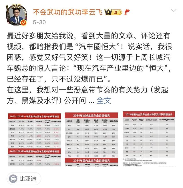 李云飞重申其5月30日的公开立场,并补充更多背景信息。他直指“某车企”自去年下半年以来持续发起针对汽车行业的“高负债率”、“财务造假”、“财务审计”及“车圈恒大”等话题讨论,煽动舆论。