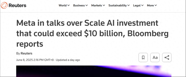 【环球网科技综合报道】6月9日消息,据外媒报道,Meta考虑对人工智能初创公司Scale AI 进行超过 100 亿美元的投资,目前正进行谈判。