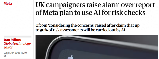 【环球网科技综合报道】6月9日消息,据外媒报道,多个行业组织对英国通信管理局(Ofcom)呼吁,限制 Meta在关键风险评估中使用人工智能。英国通信管理局表示,正在“考虑”活动人士提出的担忧。