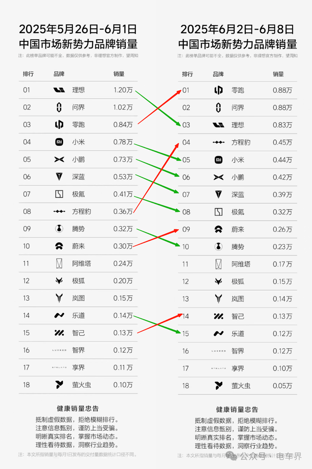 2025年第23周(6月2日-6月8日)新势力品牌销量榜出炉,相较前一周,市场整体出现显著波动,多数品牌销量下滑,排名也发生明显变化。
