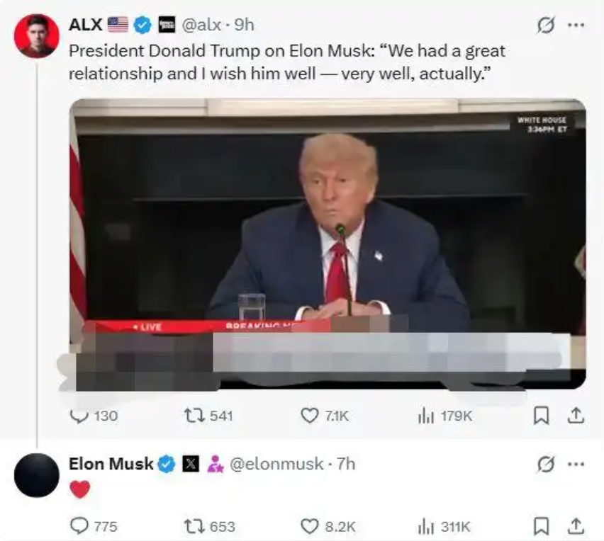 8日至9日,马斯克删除了一些批评特朗普的帖子,并转发了特朗普有关洛杉矶骚乱的消息,此举被视为一种求和。