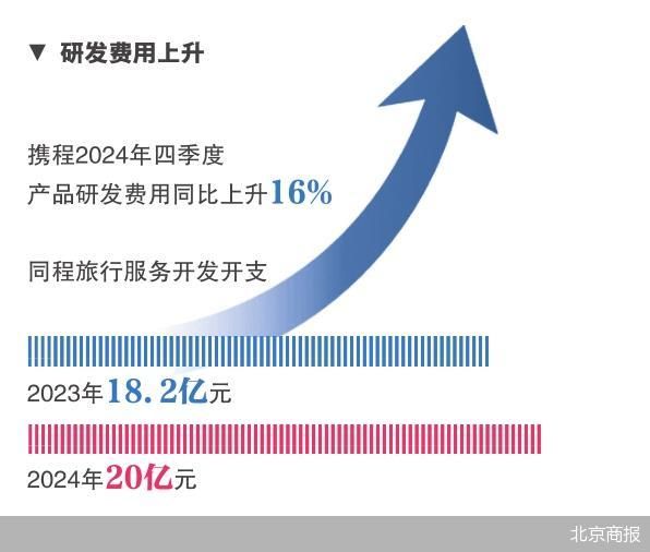 携程发布的2024年四季度及全年业绩公告显示,2024年四季度产品研发费用为34亿元,同比上升16%,主要由于产品研发人员相关费用产生了变动。2024年全年,产品研发费用为131亿元,同比上升8%,占净营业收入的25%。