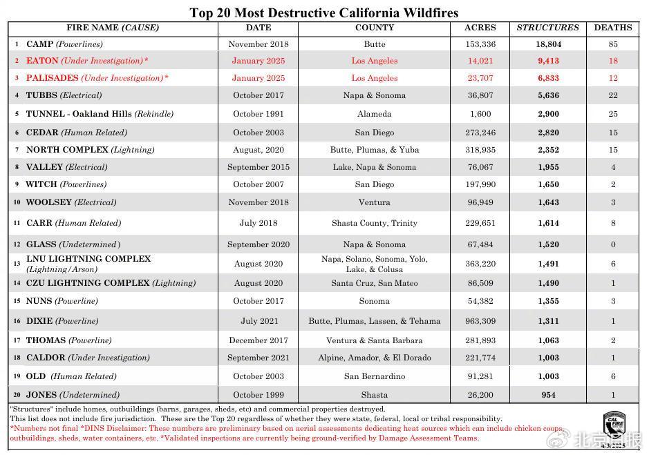 根据美国加州林业和消防局的统计,本次在洛杉矶发生的山火中的两起——伊顿山火和帕利塞德山火,分别列入加州历史上最严重的20起山火中的第二位与第三位。截至4月3日,死于这两起严重山火的遇难者人数已升至30人。