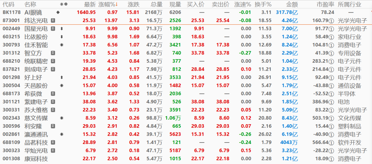 【环球网财经综合报道】6月12日,AI眼镜概念在二级资本市场掀起波澜,成为市场焦点,多只个股强势拉升,开盘即现竞价涨停态势。截至收盘,纬达光电(873001)涨幅为13.97%、国星光电(002449)、比依股份(603215)封至涨停板,佳禾智能(300793)、智立方(301312)等个股亦纷纷跟涨。