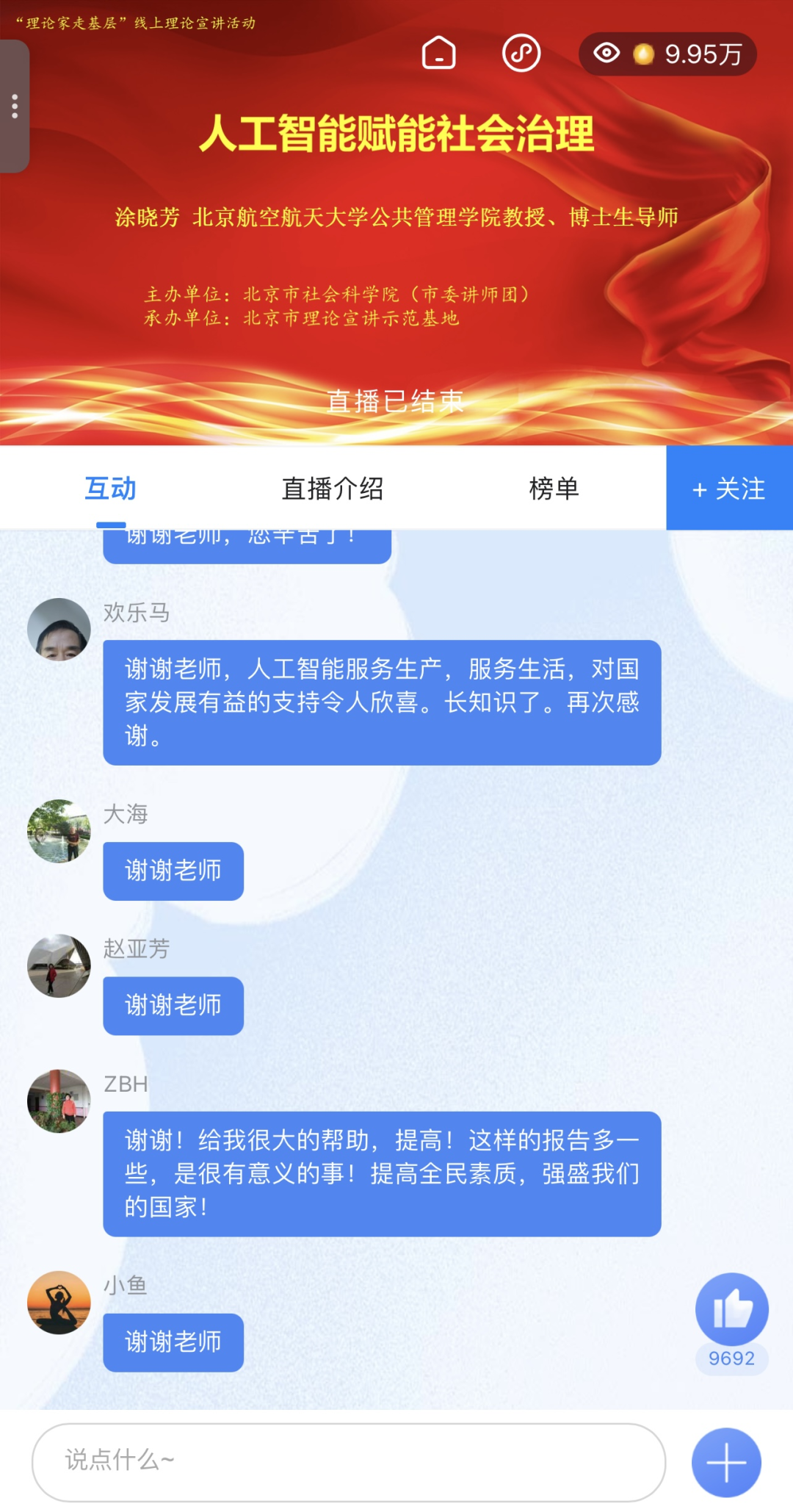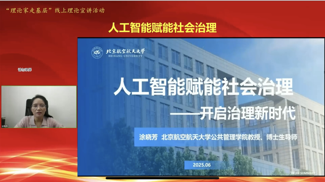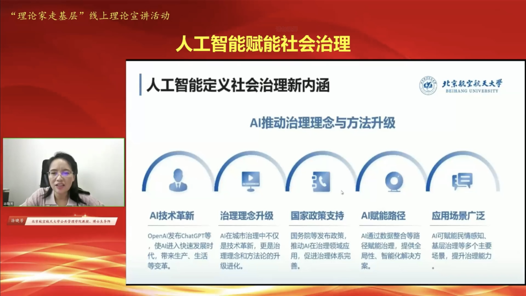 习近平总书记指出:“通过大数据、云计算、人工智能等手段推进城市治理现代化,大城市也可以变得更‘聪明’。从信息化到智能化再到智慧化,是建设智慧城市的必由之路,前景广阔。”6月11日,北京市社会科学院(市委讲师团)举办“理论家走基层”线上宣讲活动,邀请北京航空航天大学人文社会科学学院(公共管理学院)涂晓芳教授以《人工智能赋能社会治理》为题作宣讲报告。30家“理论宣讲示范基地”和全市基层党员干部群众近10万人次在线参加学习。