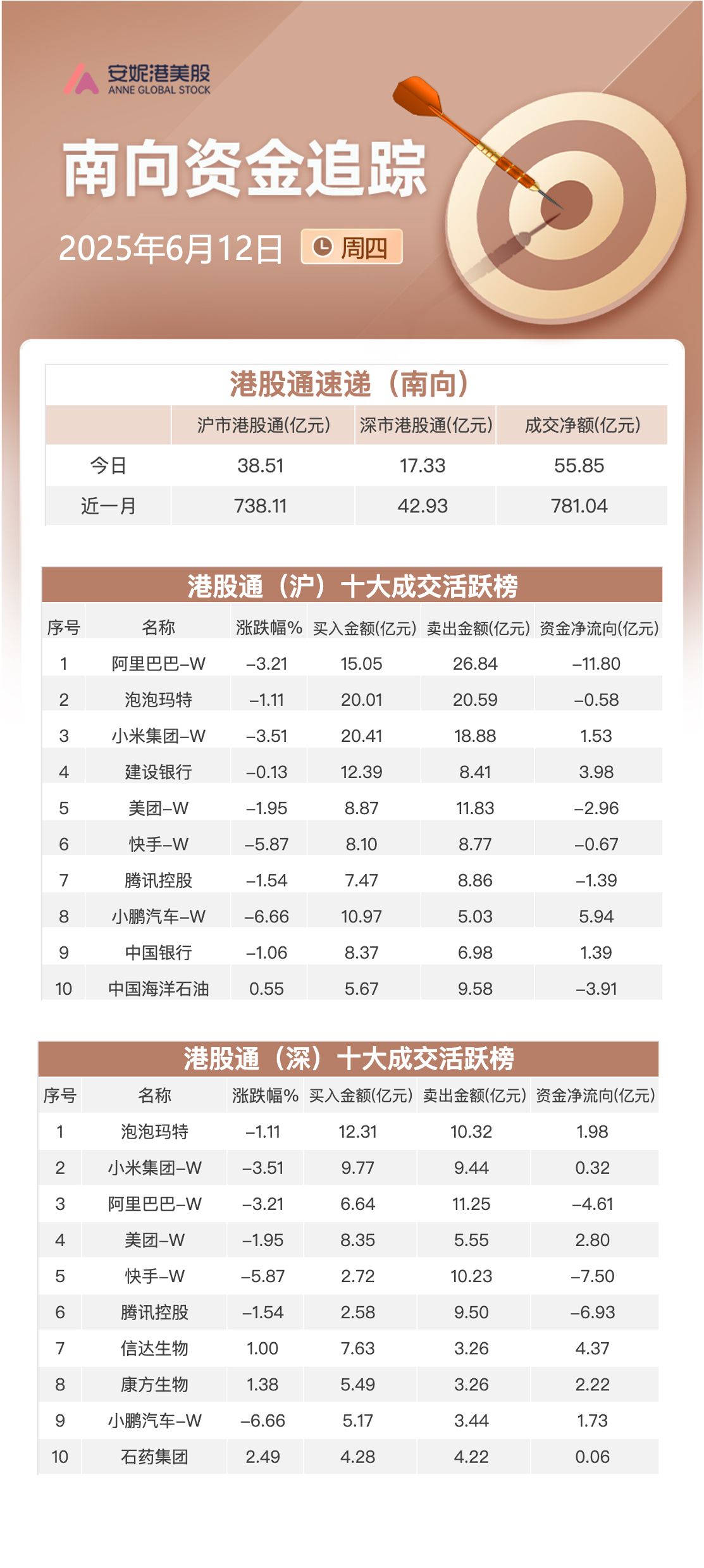 南向资金净流入约55.85亿港元,连续12个交易日保持净流入。其中沪港股通净流入约38.51亿港元,深港股通净流入约17.33亿港元。