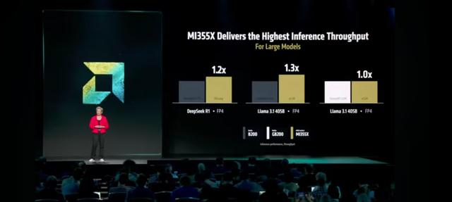 据苏姿丰介绍,MI350系列的内存容量是英伟达GB200的1.6倍,在多个精度下的运算表现优于英伟达GB200和B200。在FP4精度下,当运行DeepSeek-R1或Llama3.1时,MI355每秒可以产生比英伟达B200多出20%~30%的tokens(词元),表现与更昂贵的GB200相当。与竞争对手的解决方案相比,客户投资MI355,每美元的投资能多生成40%的tokens。
