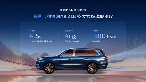 率先搭载雷神EM-P AI电混的吉利银河M9,匹配独立三电机,0-100km/h加速时间仅为4.5s,同级第一;百公里馈电油耗仅为4L级,综合续航里程超过1500km,同样同级第一。