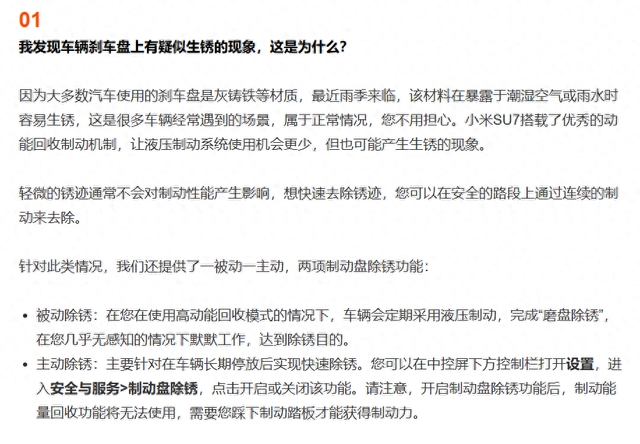 答:因为大多数汽车使用的刹车盘是灰铸铁等材质,最近雨季来临,该材料在暴露于潮湿空气或雨水时容易生锈,这是很多车辆经常遇到的场景,属于正常情况,您不用担心。小米SU7搭载了优秀的动能回收制动机制,让液压制动系统使用机会更少,但也可能产生生锈的现象。