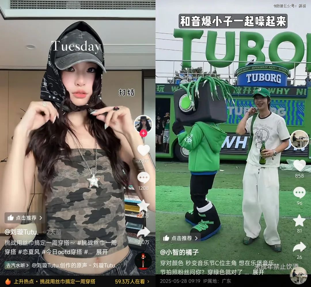 “刘璇tutu.”和“小智的橘子”是典型的技巧派,“刘璇tutu.”在视频中分享了如何用一条丝巾搭出一周穿搭,且每套穿搭都各具风情,“小智的橘子”则通过帽子、背包、挂饰等小道具,教学如何在适配音乐节主题的同时秒变C位。