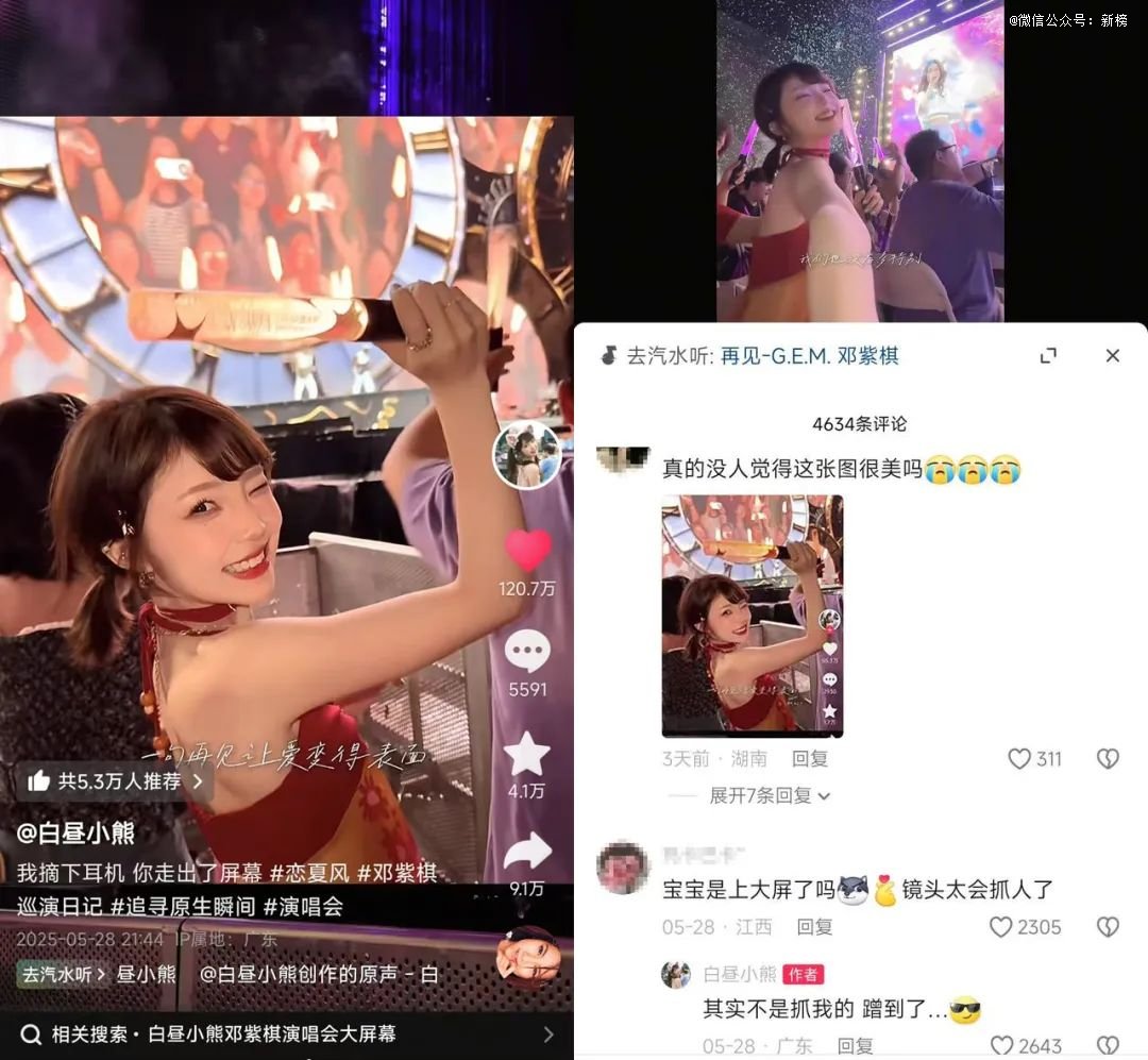 曾带火多巴胺穿搭的“白昼小熊”为了参加邓紫棋演唱会的演唱会,就一改之前的多巴胺甜妹风,换上一套红色吊带裙,变身辣妹在演唱会上放肆地唱歌、大笑。这种把音乐现场变身个人秀场的热情氛围,让“白昼小熊”的这条视频获赞超120万。