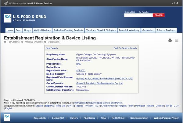 (FHTFF福活肽--重组人源化胶原蛋白衍生产品 I 型胶原凝胶敷料FDA注册信息页面)