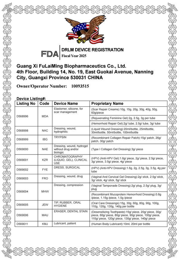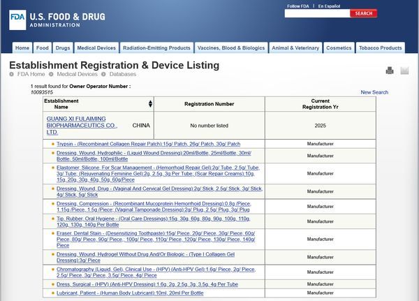 (PHPV融合肽--重组类胶原蛋白衍生产品PHPV卡拉胶凝胶FDA注册信息页面)注册信息显示,福莱明生物医疗器械产品已完整录入 FDA 数据库,涵盖企业代码、产品列名号、监管编号等关键信息,为后续出口清关等流程提供了合规保障。例如,其核心产品 “I 型胶原凝胶敷料” 与 “PHPV 卡拉胶凝胶” 的注册页面已公开可查,标志着技术转化成果获得国际权威机构背书。(FHTFF福活肽--重组人源化胶原蛋白衍生产品 I 型胶原凝胶敷料FDA注册信息页面)