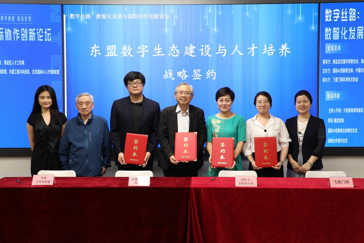 “数字丝路:数智化发展与国际协作创新论坛”由飞诺门阵科协独家承办。飞诺门阵作为中国云体系联盟重要成员单位、国际AI创新体的发起单位之一,长期搭建国际科技合作平台,推进国际化进程,拓展全球视野并深度融入国际科技合作的浪潮中。飞诺门阵科协作为海淀区科协直属的基层科技组织,自成立以来得到海淀区科协的全力支持。作为本次论坛的重磅环节,飞诺门阵同东盟工程与科技院、国际AI创新联合体、中国云体系联盟四方共同签署国际战略合作协议,就国际化数字生态建设、AI人才培养与学术交流、规则与标准共建等达成合作;马来西亚拉曼大学校长尤芳达院士、云体系联盟秘书长沈寓实院士、国际AI创新体孙丹副理事长和飞诺门阵刘星妍总裁代表四方签约,徐锭明主任、宾智慧副主席和丁洁瑶律师等领导专家共同见证。会上还举行了国际AI创新联合体顾问聘任仪式,徐锭明主任和尤芳达院士受聘担任联合体顾问,沈寓实和孙丹为两位顾问颁发聘书。会前,尤芳达院士还亲临飞诺门阵总部参观指导,并举行小规模座谈,就双方在推动数字丝路建设、加强AI技术研发与应用、促进学术交流等领域合作达成高度合作。