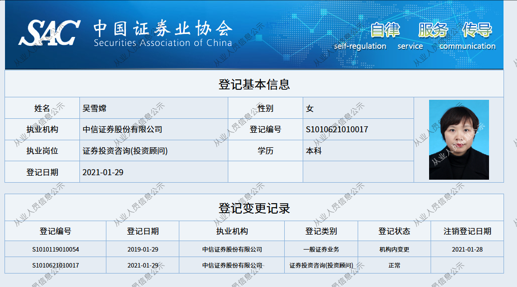 中证协从业人员信息公示显示,2019年1月29日,吴雪嫦登记执业机构为中信证券,从事一般证券业务;2年后,即2021年1月29日,吴雪嫦执业登记类别为中信证券的证券投顾。