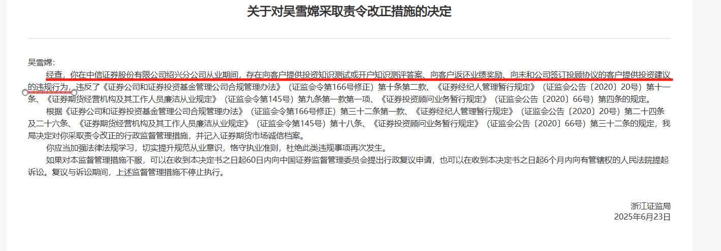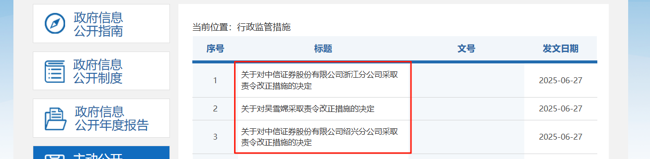 6月27日,浙江证监局披露3张罚单,吴雪嫦、中信证券绍兴分公司及浙江分公司一同被采取责令改正措施。