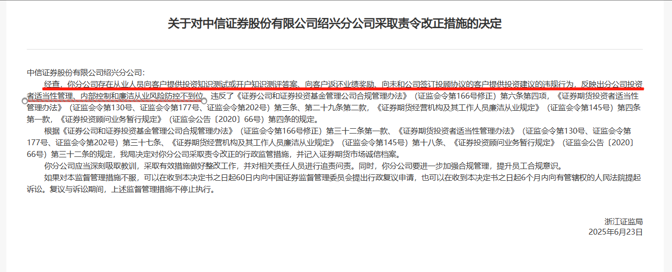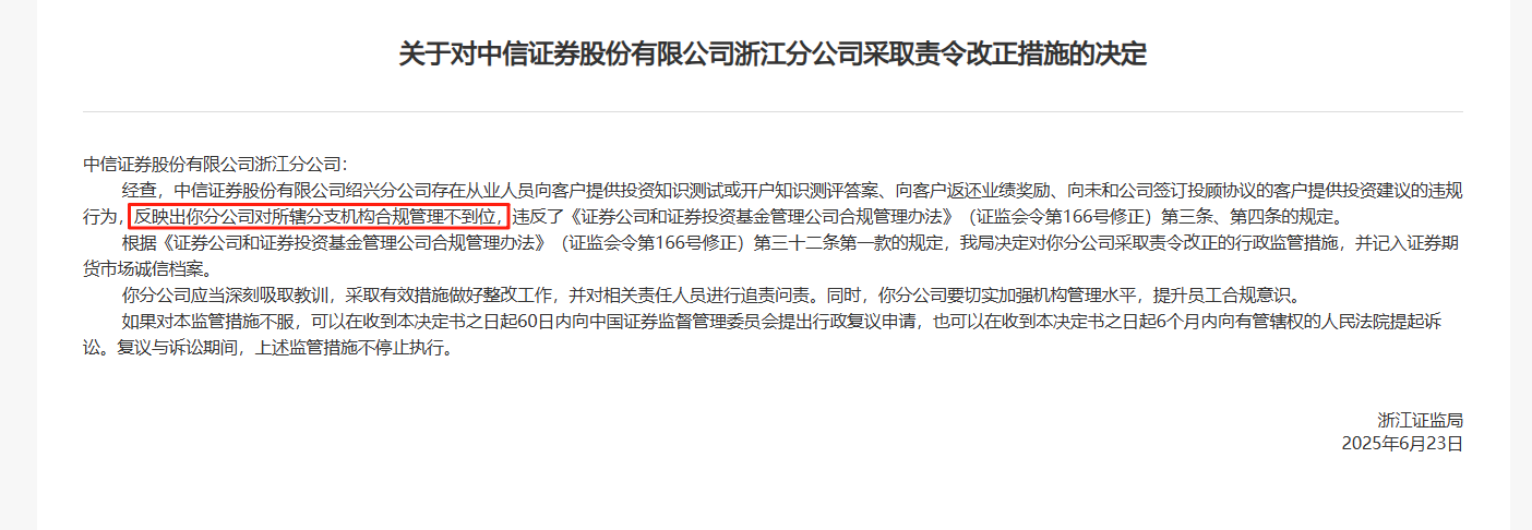 浙江证监局要求,中信证券浙江分公司、绍兴分公司应当深刻吸取教训,采取有效措施做好整改工作,并对相关责任人员进行追责问责。同时,中信证券浙江分公司要切实加强机构管理水平,中信证券绍兴分公司要进一步加强合规管理,提升员工合规意识。