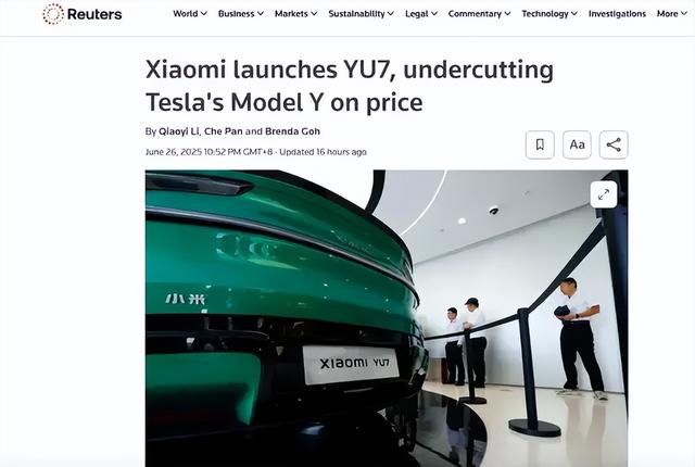 路透社称,小米YU7的起售价为25.35万元,比同为SUV的特斯拉 Model Y价格低了近4%,“进一步在全球最大汽车市场挑战这家美国公司。”