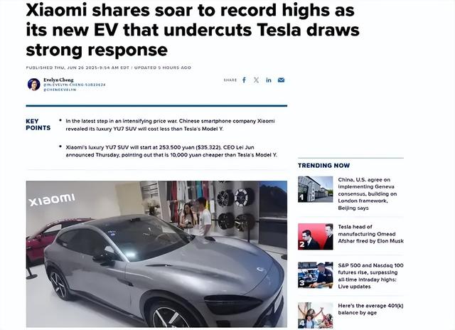 CNBC称,小米作为电动汽车市场的新参与者,凭借其新款电动车 YU7“直接瞄准了竞争对手特斯拉”。而彭博社特别提到,小米第一款电动车SU7车型今年以来的销量就已经超过了特斯拉 Model 3。另据汽车销售数据显示,今年5月,小米SU7车型在中国的销量为2.8万辆,超过了Model Y 的2.47万辆。