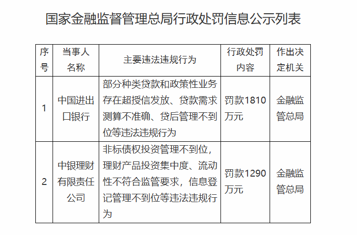 其中,中国进出口银行因存在部分种类贷款和政策性业务存在超授信发放、贷款需求测算不准确、贷后管理不到位等违法违规行为,被罚1810万元。