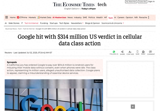 【环球网科技综合报道】7月2日消息,据外媒报道,美国加州圣克拉拉县高等法院陪审团周二作出里程碑式裁决,认定谷歌母公司Alphabet滥用安卓用户隐私,需向该州安卓智能手机用户支付总计3.146亿美元(约合人民币22.8亿元)的赔偿金。这一判决标志着美国首例针对科技巨头“后台数据传输”行为的集体诉讼取得实质性胜利,或引发全球范围内对智能设备数据收集边界的重新审视。