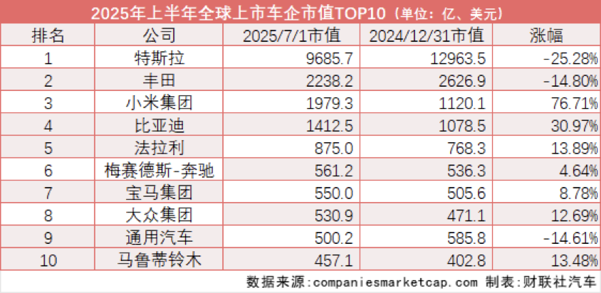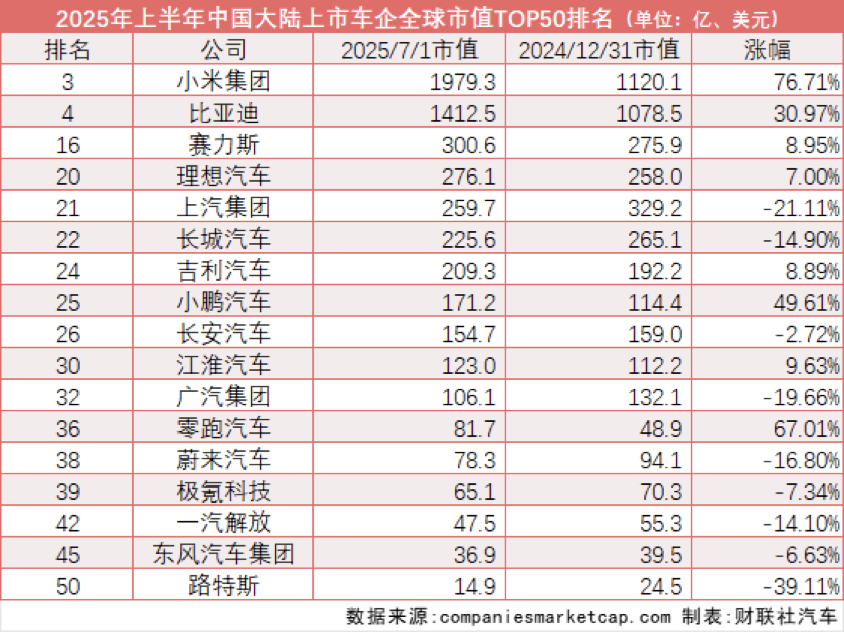 反观刚刚完成大热车型小米YU7上市的小米集团,已稳居全球车企市值排名第三位。